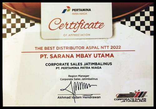 Sebagai salah satu unit usaha PT Jaya Trade Indonesia di bidang distributor aspal untuk wilayah Nusa Tenggara Timur, PT Sarana Mbay Utama kembali memperoleh prestasi dari PT Pertamina Niaga Patra sebagai The Best Distributor Aspal NTT 2022 atas kinerja pencapaian target agen di tahun 2022.