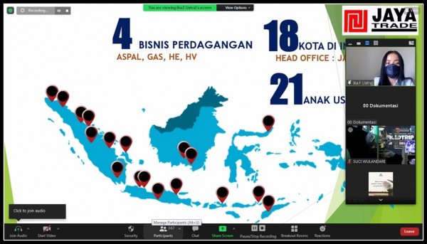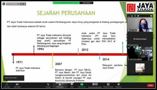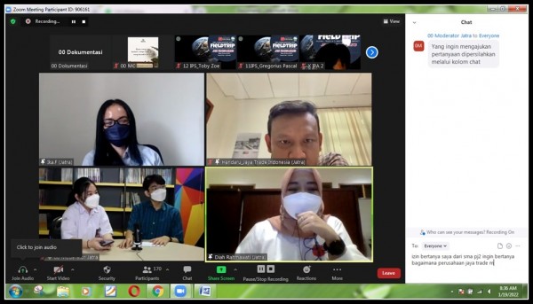 Virtual Trip diadakan melalui zoom meeting, pada tanggal 19 Januari 2022 dan diikuti oleh 300 Peserta dari kelas 1 SMA Pembangunan Jaya Bintaro dan kelas 1-3 SMA Pembangunan Jaya 2 Sidoarjo. Ibu R. Ika Fitriani selaku perwakilan dari PT Sarana Sampit Mentaya Utama Cabang Pulang Pisau yang menyampaikan pengenalan perusahaan.